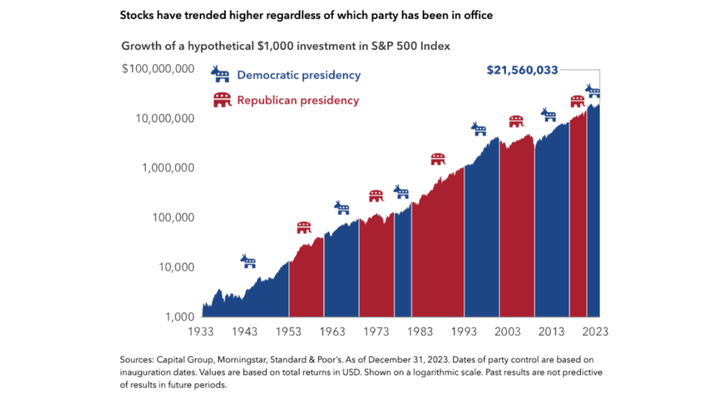 Stocks have trended higher regardless of which party has been in office https://www.capitalgroup.com/advisor/insights/articles/3-investor-mistakes-election-year.html